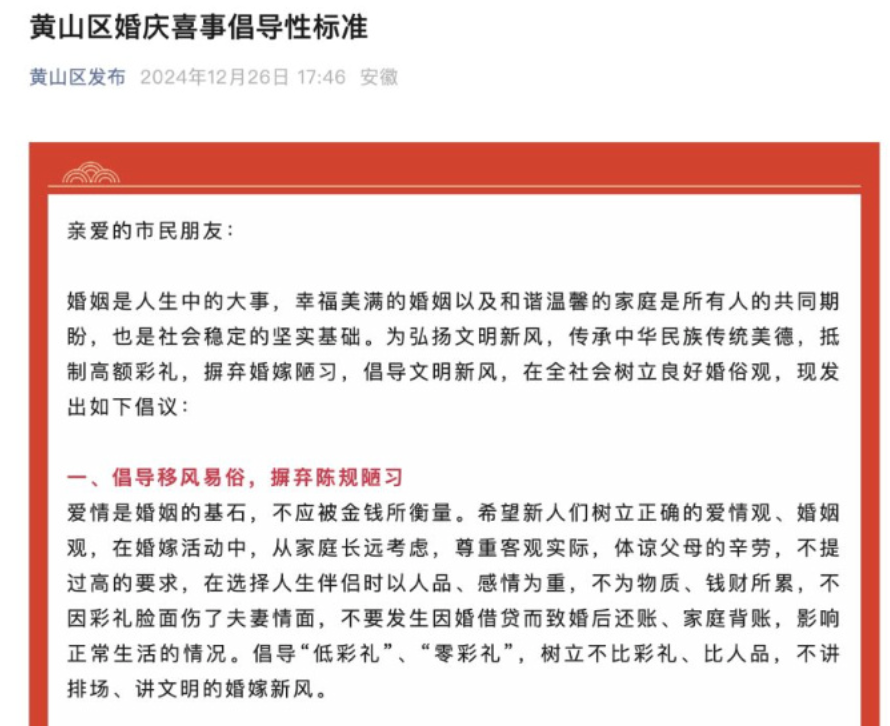 12月26日,黄山市黄山区委社会工作部、黄山区委宣传部、黄山区民政局、黄山区农业农村局、共青团黄山区委员会、黄山区妇女联合会联合发出《婚庆喜事倡导性标准》,该“倡导”中,提倡彩礼(嫁妆)不高于6万元,不滥发请柬、不铺张浪费,提倡亲友随礼不高于400元。