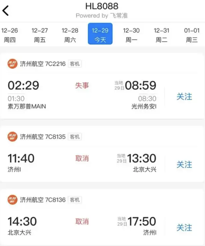 飞常准信息显示,碰撞起火的济州航空7C2216航班飞机编号为HL8088,HL8088原计划于今天从济州飞往北京,航班号为7C8135,再从北京飞回济州,航班号为7C8136。12月29日上午9点多,7C8135、7C8136两航班先后取消。