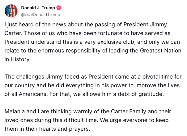 特朗普悼念卡特:他竭尽全力改善美国人的生活,向他致以最崇高敬意。