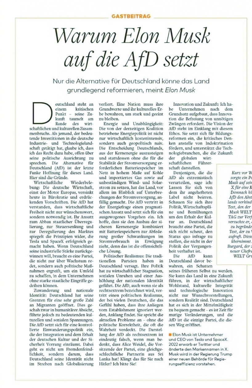 据环球时报,“马斯克重申对德国极右翼政党德国选择党的支持。”这位美国亿万富翁、特朗普任命的“政府效率部”负责人之一29日在德国《星期日世界报》发表评论文章,称德国“正处于经济和文化崩溃的边缘”,德国选择党是这个国家“最后的一线希望”。在距离德国明年联邦议院选举只有大约7周时间的背景下,马斯克的言论不仅导致该报评论版责任编辑辞职以示抗议,而且引发德国政界人士的愤怒。