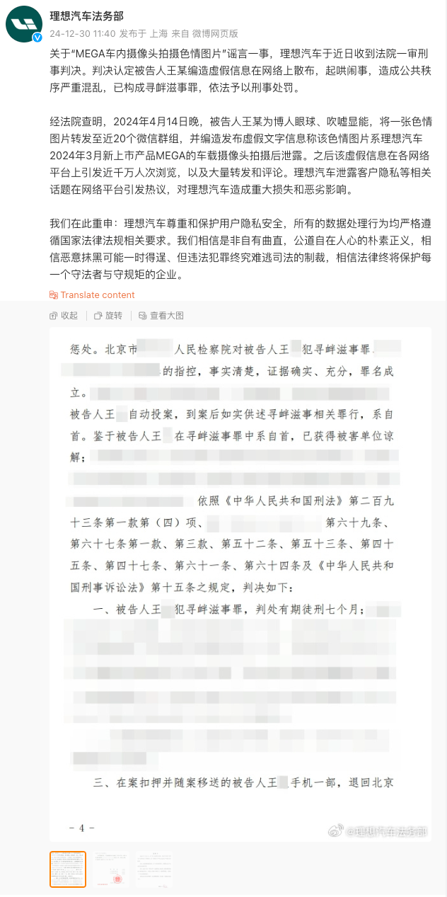 理想MEGA车内摄像头拍色情图片造谣者获刑。