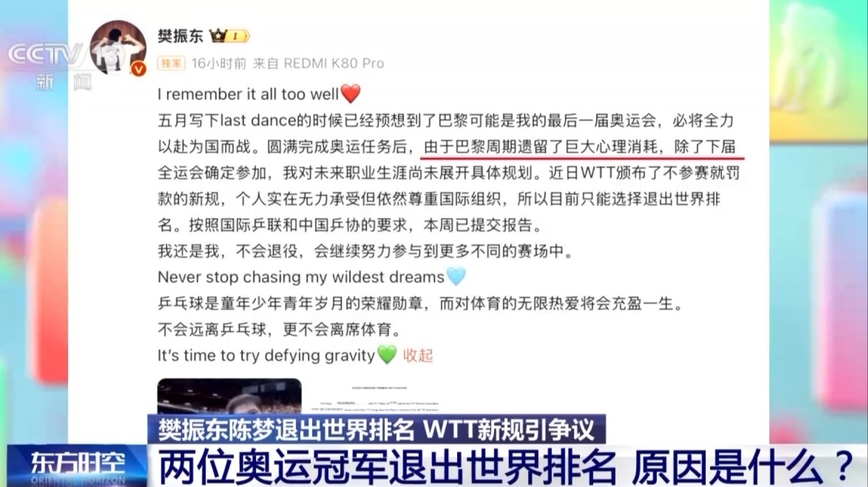 对此,WTT回应表示,樊振东和陈梦提到的规则并非新规,自四年前WTT成立以来一直沿用至今,而罚款是为确保选手参赛。两位奥运冠军到底为什么退出世界排名?