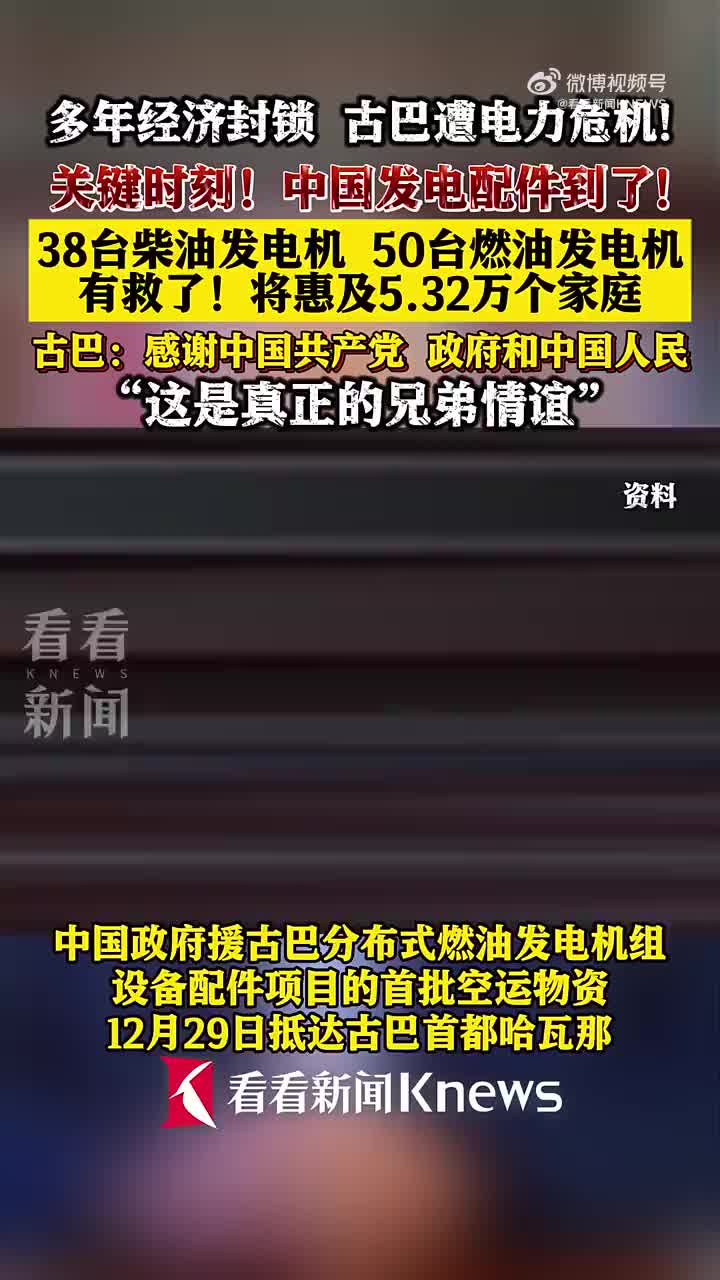 中国政府援古巴分布式燃油发电机组设备配件项目的首批空运物资当地时间12月29日抵达古巴首都哈瓦那何塞·马蒂国际机场。古巴外贸外资部副部长德沃拉·里瓦斯在接受捐赠时,代表古巴政府和人民对中国政府的援助表示感谢,并表示这将使38台柴油发电机得以恢复工作,50台燃油发电机得以维修,并将惠及古巴5.32万个家庭的用电消费。(via 看看新闻KNEWS)