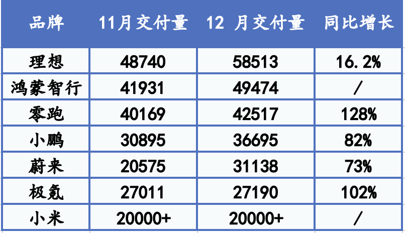 据澎湃新闻,2025年1月1日,包括理想、蔚来、鸿蒙智行等在内的多家造车新势力先后公布2024年12月交付信息,理想以5.85万辆的历史新高稳坐新势力12月销冠。此外,鸿蒙智行、零跑、蔚来、小鹏、极氪均创下月度交付量历史记录。
