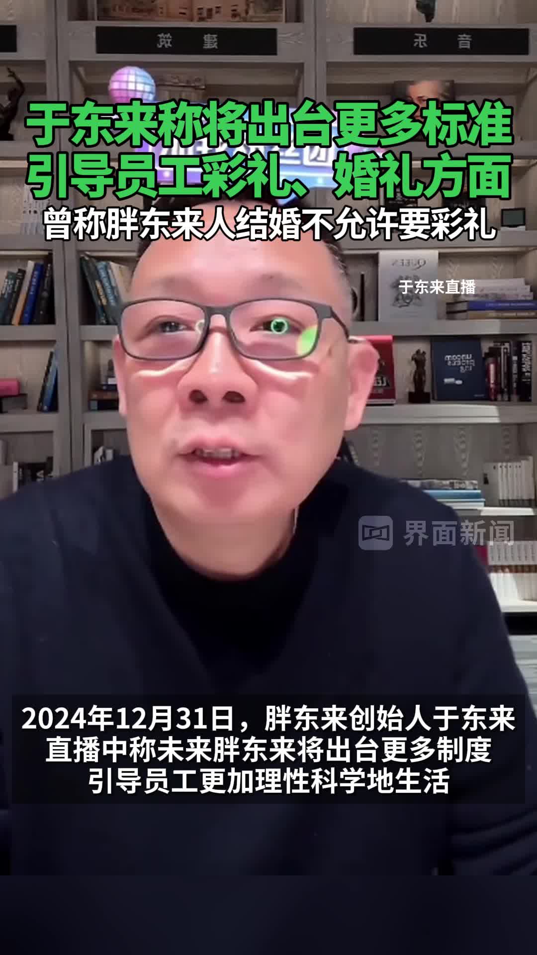 据界面新闻,2024年12月31日,胖东来创始人于东来直播中称未来胖东来将出台更多制度,引导员工更加理性科学地生活。 于东来表示,要让员工明白如何去对待爱情、对待婚姻。 此前11月20日,于东来曾在抖音称:“胖东来人结婚不允许要彩礼或付彩礼,婚礼不能铺张浪费,酒席只能邀请亲朋好友,且不能超过五桌。如果做不到,公司从制度建设上制定将取消一切福利!”(via 界面新闻)