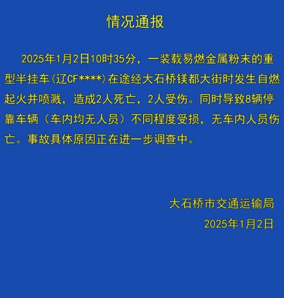 辽宁大石桥市交通运输局1月2日发布情况通报称,1月2日10时35分,一装载易燃金属粉末的重型半挂车(辽CF****)在途经大石桥镁都大街时发生自燃起火井喷溅,造成2人死亡,2人受伤。同时导致8辆停靠车辆(车内均无人员)不同程度受损,无车内人员伤亡。事故具体原因正在进一步调查中。