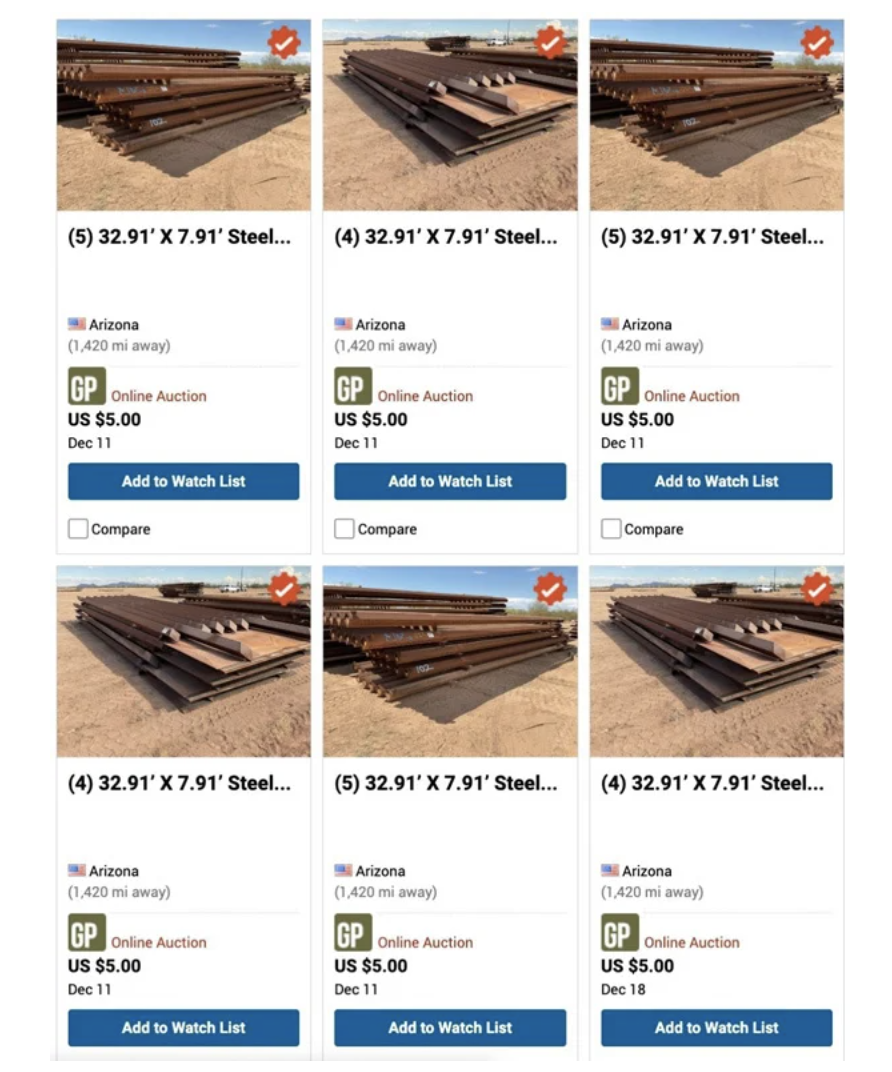 帖子还配了一张拍卖网站的截图,图中显示,一些存放在亚利桑那州皮纳尔民用机场的钢材,每块起拍价均为5美元。