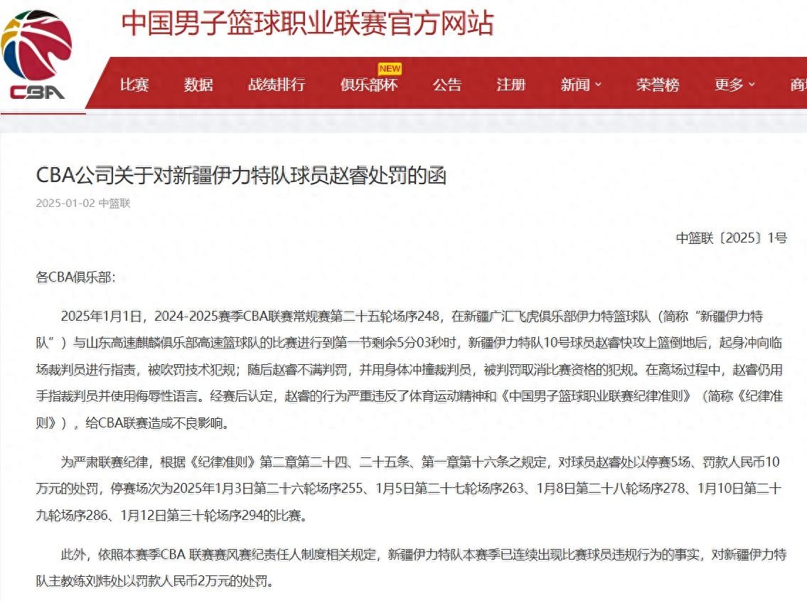 公告称,2025年1月1日,2024-2025赛季CBA联赛常规赛第二十五轮场序248,在新疆广汇飞虎俱乐部伊力特篮球队与山东高速麒麟俱乐部高速篮球队的比赛进行到第一节剩余5分03秒时,新疆伊力特队10号球员赵睿快攻上篮倒地后,起身冲向临场裁判员进行指责,被吹罚技术犯规;随后赵睿不满判罚,并用身体冲撞裁判员,被判罚取消比赛资格的犯规。在离场过程中,赵睿仍用手指裁判员并使用侮辱性语言。经赛后认定,赵睿的行为严重违反了体育运动精神和《中国男子篮球职业联赛纪律准则》(简称《纪律准则》),给CBA联赛造成不良影响。