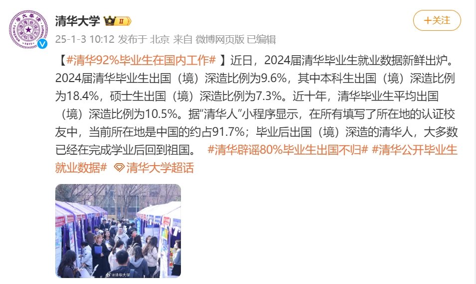 清华大学公布约92%毕业生在国内工作。