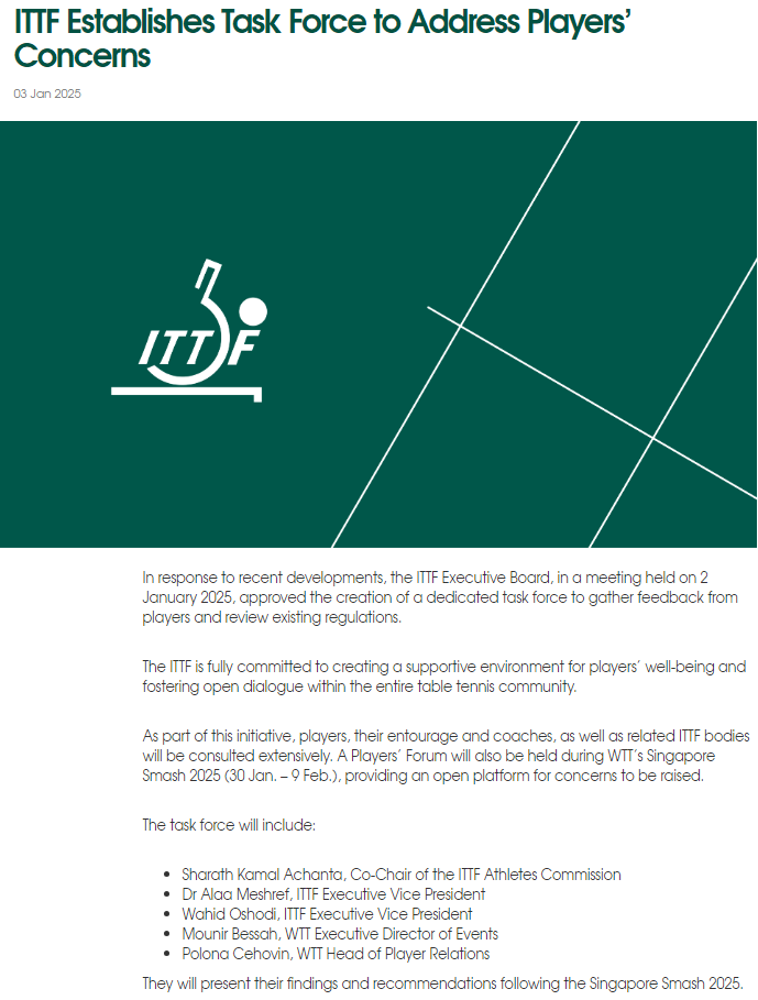 作为这项行动的一部分,将广泛征求球员、随行人员和教练以及国际乒联相关机构的意见,在1月30日至2月9日进行的WTT新加坡大满贯2025期间,还将举办球员论坛,为提出关切问题提供一个开放的平台。