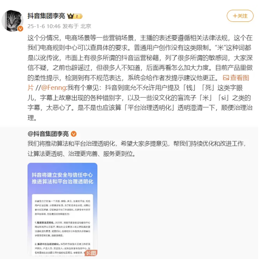 对此,李亮在个人社媒回应称:“这个分情况,电商场景等一些营销场景,主播的表述要遵循相关法律法规,这个在我们电商规则中心可以查具体的要求。普通用户创作没有这类限制。‘米’这种词都是以讹传讹,市面上有很多所谓的抖音运营秘籍,列了很多所谓的敏感词,大家深信不疑,之前也辟谣过,但很多人不知道,后面再看怎么加大力度。目前产品里做的柔性提示,检测到有不规范表达,系统会给作者发提示建议他更正。”