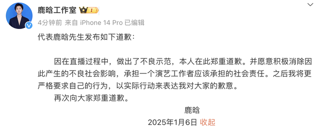 据界面,1月6日,鹿晗工作室微博发文代表鹿晗发布道歉。具体如下: