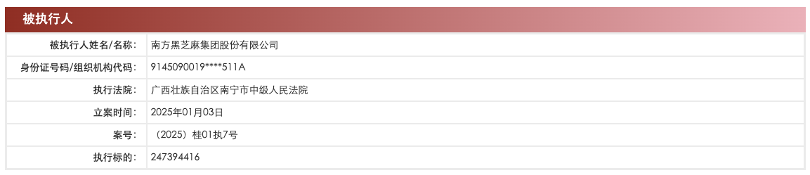 中国执行信息公开网显示,1月3日,黑芝麻(000716)、拾穗健康产业(深圳)有限公司等新增一则被执行人信息,执行标的约2.47亿元,涉及金融借款合同纠纷案件,执行法院为广西壮族自治区南宁市中级人民法院。
