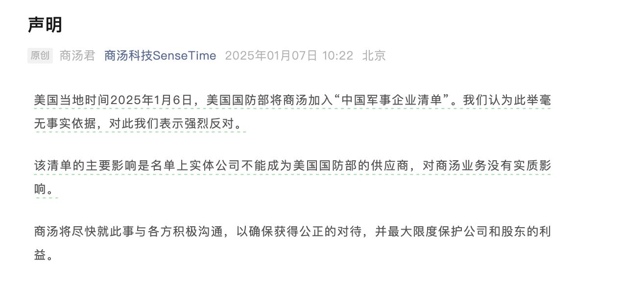 1月7日,商汤科技发布声明称,美国当地时间2025年1月6日,美国国防部将商汤加入“中国军事企业清单”。我们认为此举毫无事实依据,对此我们表示强烈反对。该清单的主要影响是名单上实体公司不能成为美国国防部的供应商,对商汤业务没有实质影响。商汤将尽快就此事与各方积极沟通,以确保获得公正的对待,并最大限度保护公司和股东的利益。