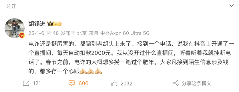 据澎湃,1月6日下午,资深媒体人胡锡进发布微博称,自己接到了一通电话,对方表示他开通了抖音直播,每天自动扣款2000元。该条微博发出后立即引发网友热议,有网友评论称:“我也接过类似的电话!”、“我妈前两天也接到了,说800。”