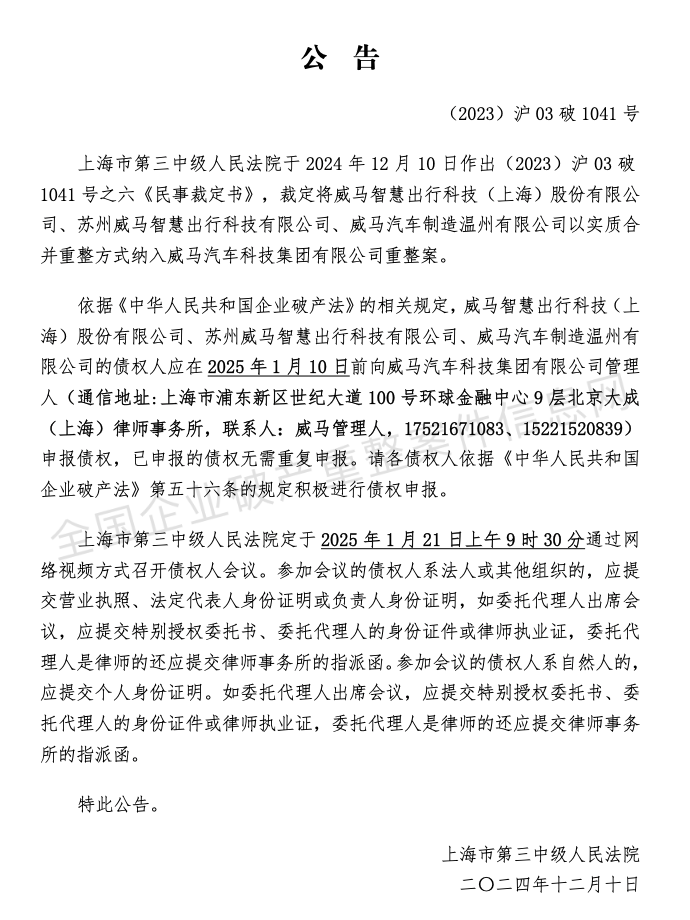 1月7日,根据上海市第三中级人民法院日前发布的公告,威马汽车科技集团有限公司重整案债权人会议定于2025年1月21日上午9时30分通过网络视频方式召开。上海三中院于2024年12月10日作出裁定,裁定将威马智慧出行科技(上海)股份有限公司、苏州威马智慧出行科技有限公司、威马汽车制造温州有限公司以实质合并重整方式纳入威马汽车科技集团有限公司重整案。四家企业的债权人应在2025年1月10日前向威马汽车科技集团有限公司管理人申报债权,已申报的债权无需重复申报。