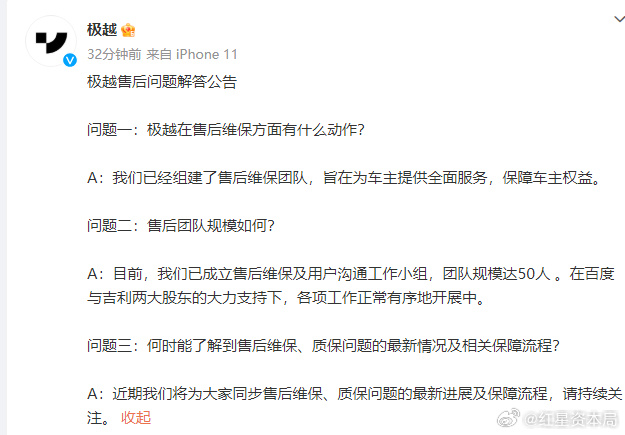 极越汽车称已成立50人售后维保工作小组,获百度与吉利支持。
