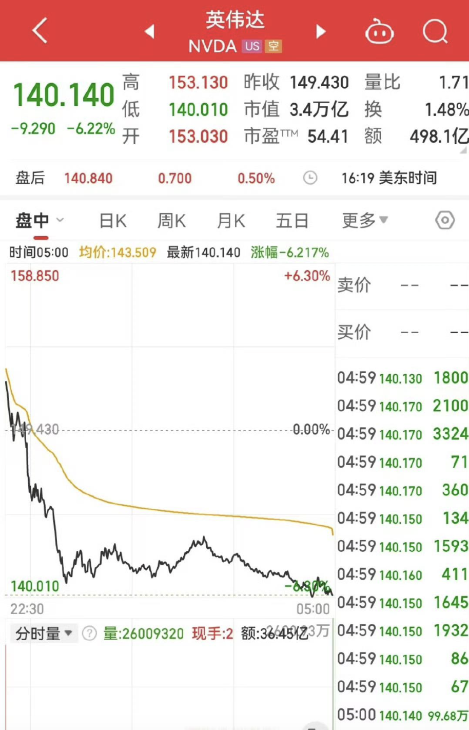 英伟达报140.14美元,跌6.22%,创下2024年9月3日以来最大单日跌幅。其市值一夜蒸发2275亿美元(约合人民币16668亿元)。