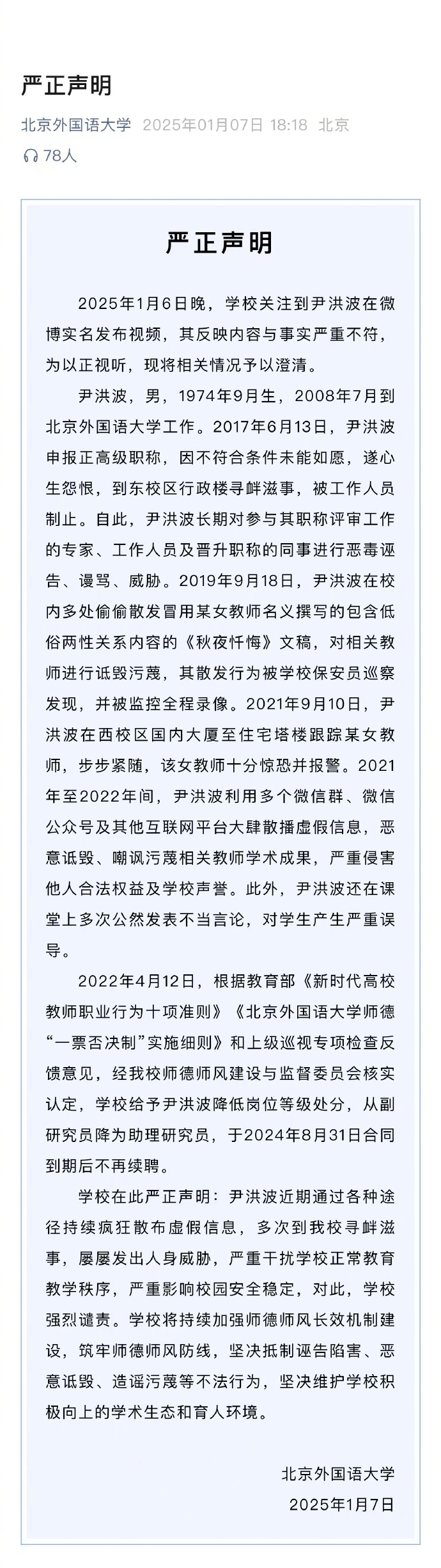 据中国新闻周刊,北京外国语大学1月7日发布声明称,2025年1月6日晚,学校关注到尹洪波在微博实名发布视频,其反映内容与事实严重不符,为以正视听,现将相关情况予以澄清。