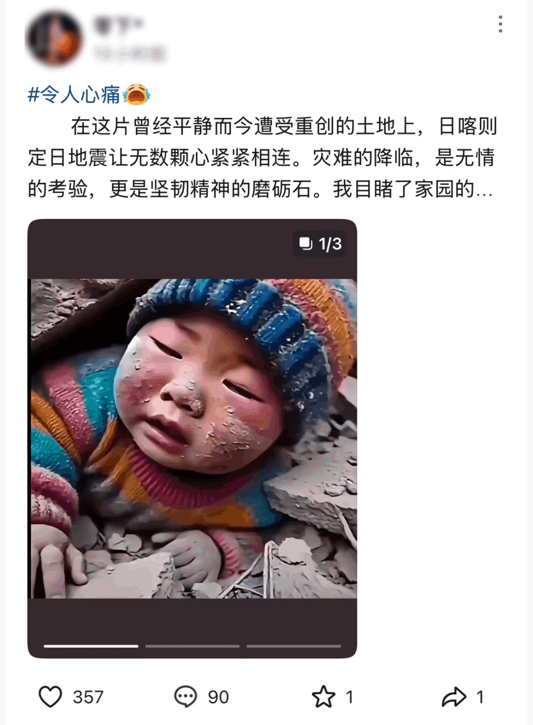 比如下面这个广泛流传在“日喀则地震”视频中的图片——一个戴帽子、被压在废墟下的小孩,其实就是由 AI 生成的。