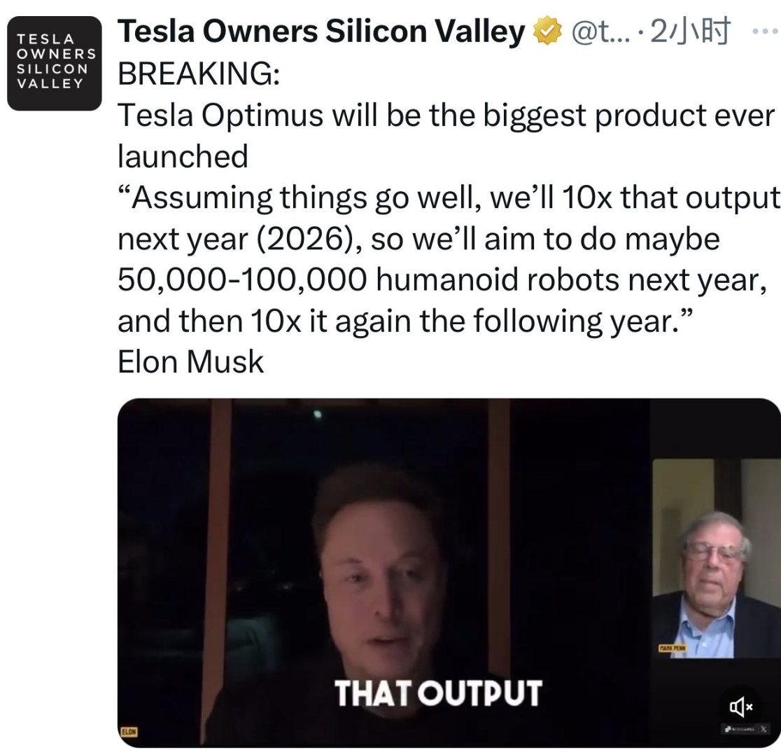 马斯克在最新连线采访中表示,如果一切进展顺利,2026年我们的人形机器人产量将增加10倍,因此我们的目标是明年生产50,000到100,000个人形机器人,然后在第二年再增加10倍。马斯克近日在一次游戏直播时曾称,未来几周内,可能会更新Optimus,其进展顺利,团队表现出色。此外,马斯克还表示,大约到2025年第二季度,FSD 将比人类驾驶员更安全。