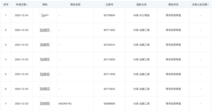 据界面新闻,在小米SU7和小米YU7两款车型之后,小米申请了多枚“U”字辈商标,或为未来新车做准备。