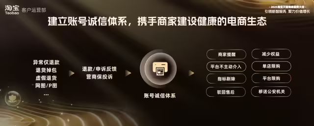 据悉,针对异常仅退款、退货掉包、虚假退货、网图/P图等行为,商家可通过投诉反馈将其录入账号诚信体系,平台视情况对其驳回售后、单店或平台限购等;对于职业羊毛党,淘宝天猫还将配合相关部门,移送司法机关。