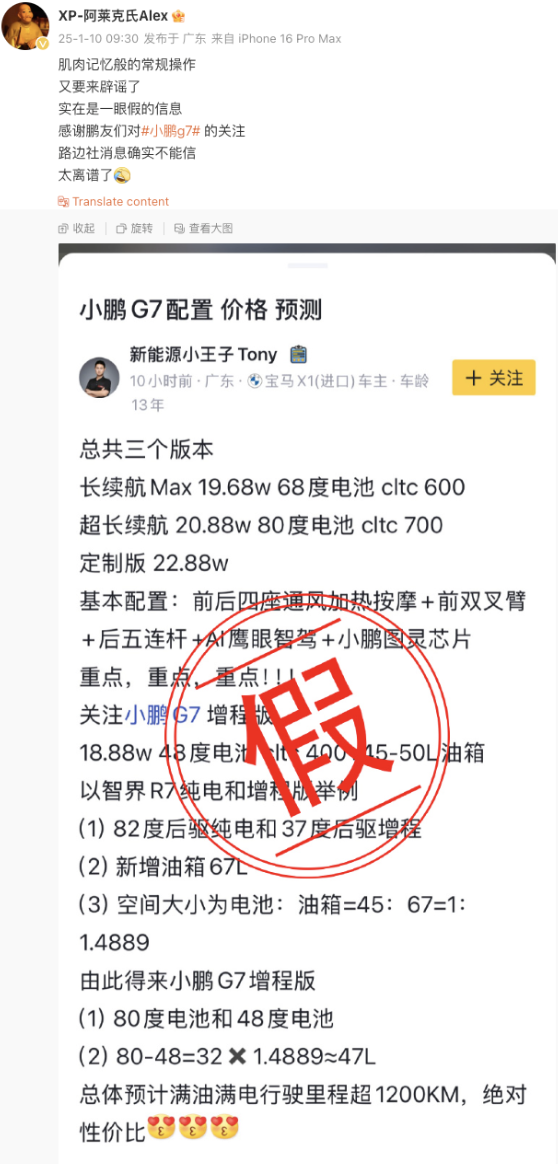 小鹏汽车辟谣网传G7售价及配置信息。