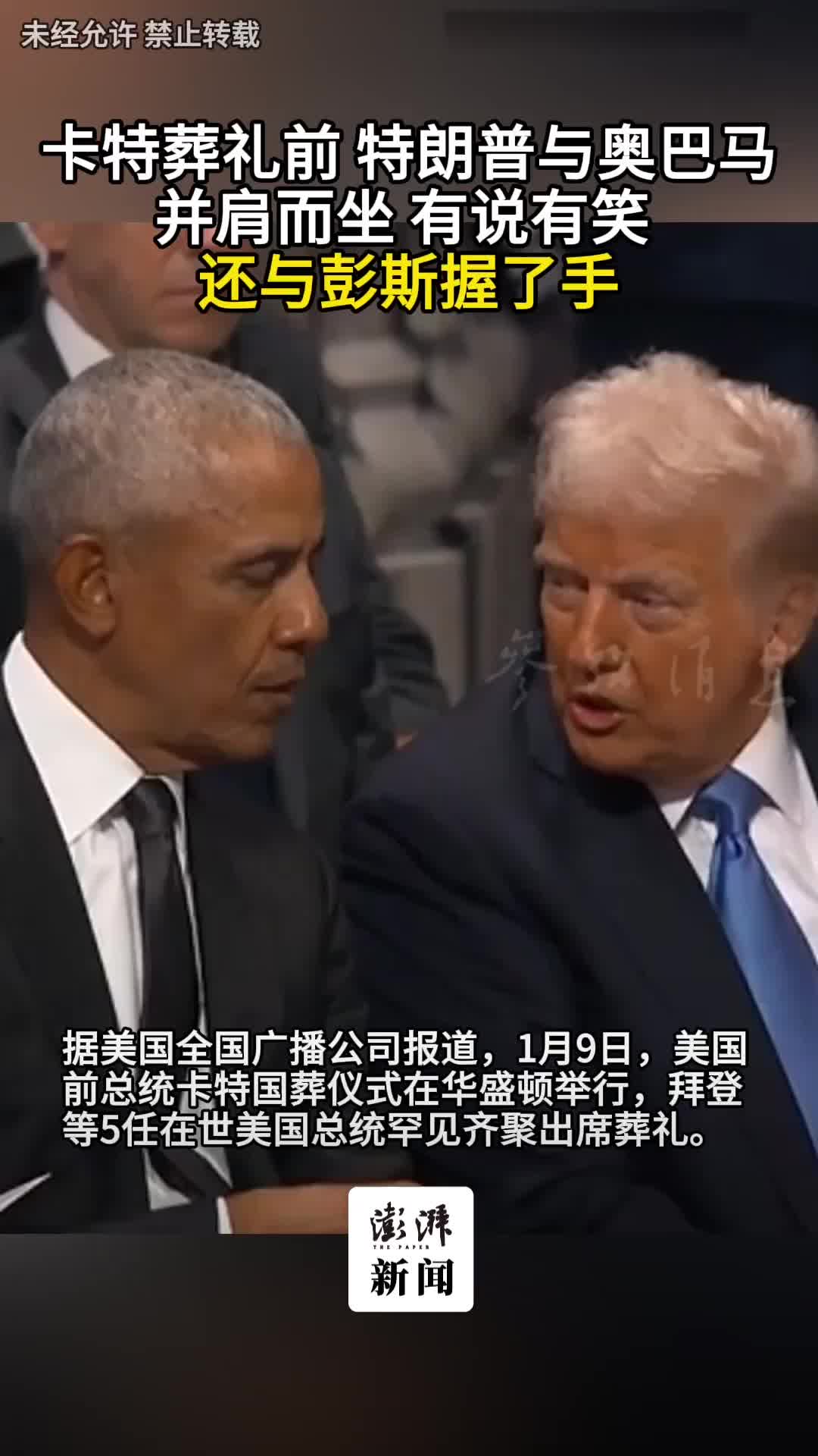 据澎湃新闻,当地时间1月9日,美国前总统卡特的国葬仪式在华盛顿国家大教堂举行,美国五任总统参加仪式。特朗普与奥巴马并肩而坐,有说有笑。(via 澎湃新闻)