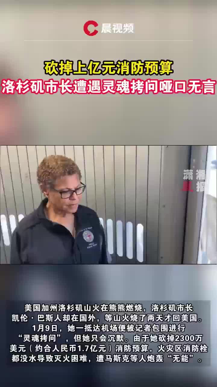 据潇湘晨报,美国加州洛杉矶山火在熊熊燃烧,洛杉矶市长凯伦·巴斯人却在国外,等山火烧了两天才回美国。1月9日,她一抵达机场便被记者包围进行“灵魂拷问”,但她只会沉默。由于她砍掉2300万美元(约合人民币1.7亿元)消防预算,火灾区消防栓都没水导致灭火困难,遭马斯克等人炮轰“无能”。