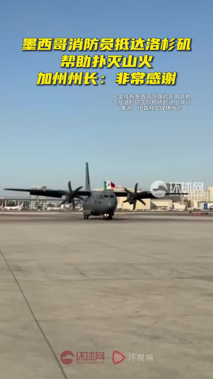 据环球网综合英国《卫报》、美国有线电视新闻网(CNN)报道,加州州长加文·纽森在社交平台X上发文称,“墨西哥的消防员刚刚抵达洛杉矶国际机场。他们将加入1.4万多名已经在与帕利塞兹大火作战的人员当中。加州非常感谢我们的邻居在这场与洛杉矶山火斗争中给予的支持。”他同时附上了一段视频,画面显示一架挂有墨西哥国旗的军用飞机正在洛杉矶国际机场跑道上滑行。