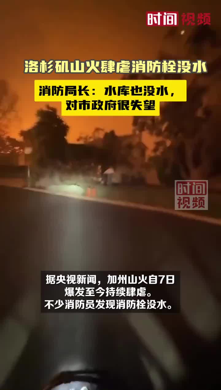 据央视新闻,美国加利福尼亚州山火自7日爆发至今持续肆虐。不少消防员发现消防栓没水。洛杉矶消防局长表示,不知道为什么水库和消防栓里没水。这事需要去问洛杉矶水电局,对市政府感到失望。消防局长提到的水库自2024年因维修关闭,山火发生时,水库里没有水,然而正常情况下,该水库可储水1.17亿加仑。当地时间1月7日,洛杉矶地区突发山火,一直持续至今,洛杉矶县法医办公室12日确认,山火造成的死亡人数升至24人。(via 时间视频)