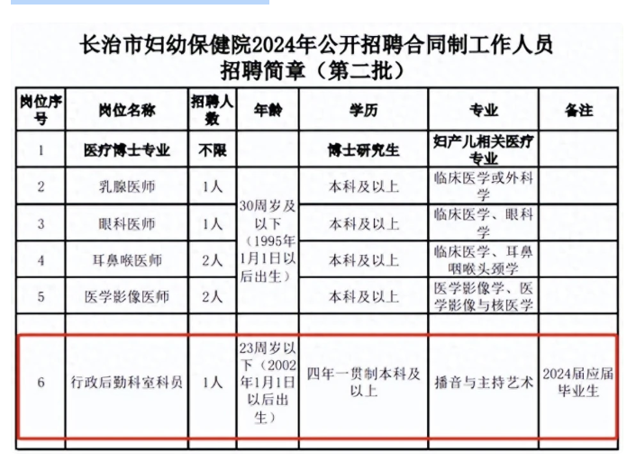 对此,有网友质疑该招聘岗位系“萝卜岗”,认为不少专业的学生都可以任职“行政后勤”岗位,但院方却指定“播音与主持艺术”专业,且要求必须2024届应届生,对年龄也有要求,“其他专业,和一些复读后就业的大学生都会被该硬性门槛筛掉。”“虽写着本科及以上,可绝大多数硕士生很难符合2002年1月1日以后出生的要求。”