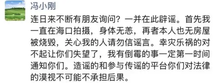 1月14日,红星新闻记者发现,冯小刚已在朋友圈发文辟谣:“连日来不断有朋友询问?一并在此辟谣。首先我一直在海口拍摄,身体无恙,再者本人也无房屋被烧毁,关心我的人请勿信谣言。幸灾乐祸的对不起让你们失望了,我有倒霉的事一定第一时间通知你们。造谣的和参与传谣的平台你们对法律的漠视不可能不承担后果。”