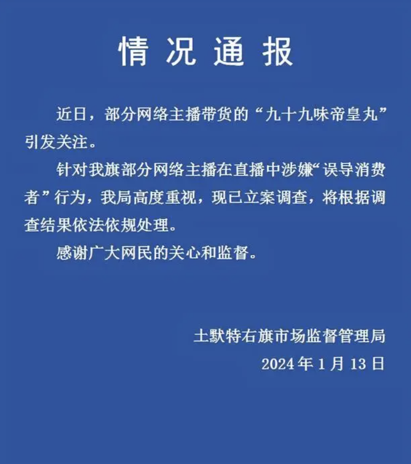 主播带货“九十九味帝皇丸”涉嫌误导消费者,内蒙古土默特右旗官方通报:已立案调查。