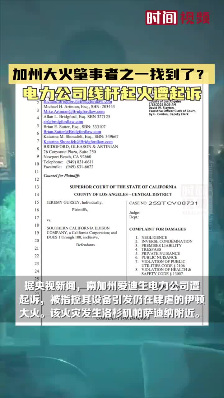 诉讼称,该公司一根电线杆是引发火灾的根源,火灾最终摧毁阿尔塔迪纳社区大片区域。美国加州南部山火已经持续肆虐近一周,已造成24人死亡。(via 时间视频)