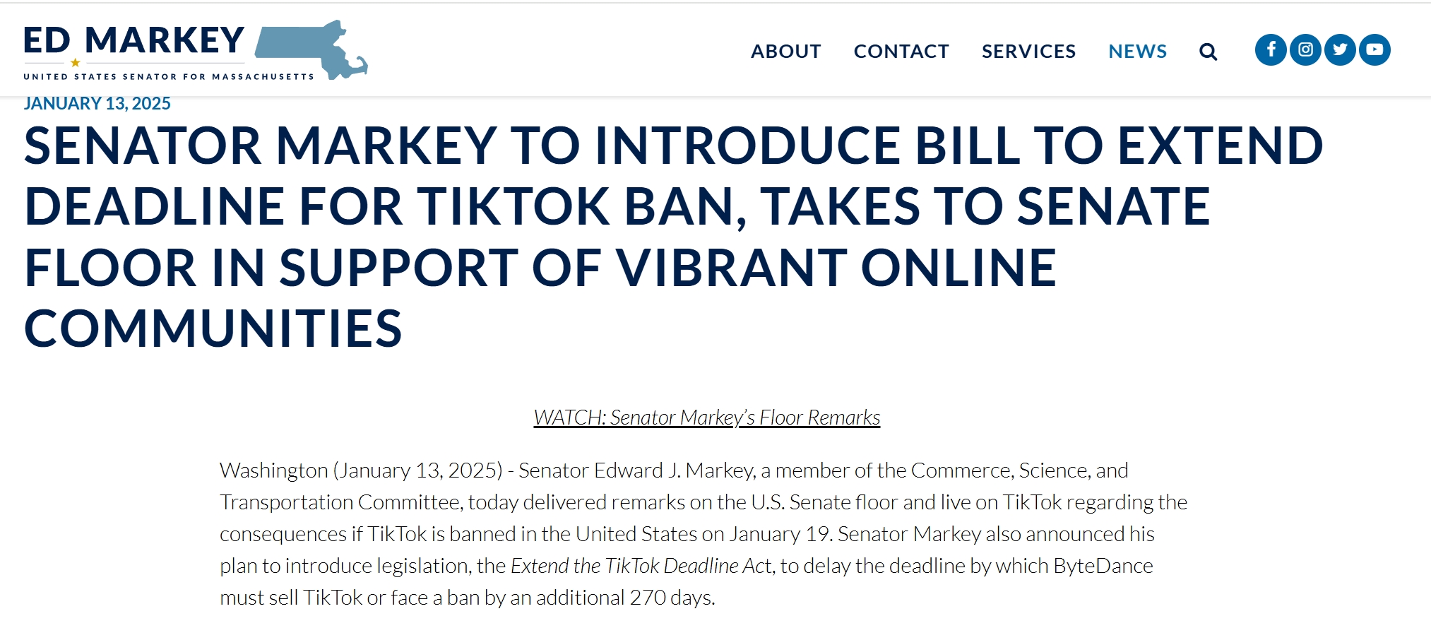 美东时间本周一,美国马萨诸塞州参议员爱德华·马基(Edward Markey)在美国参议院发表讲话并在TikTok上直播。他在讲话中谈及这项禁令时表示,他计划提出立法,将TikTok“不卖就禁”禁令的最后期限再推迟270天。