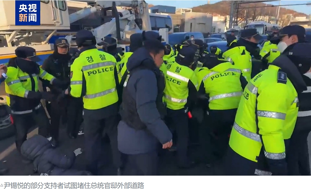 当天,国民力量党议员再次集结在总统官邸前,尹锡悦的部分支持者试图堵住总统官邸外部道路。