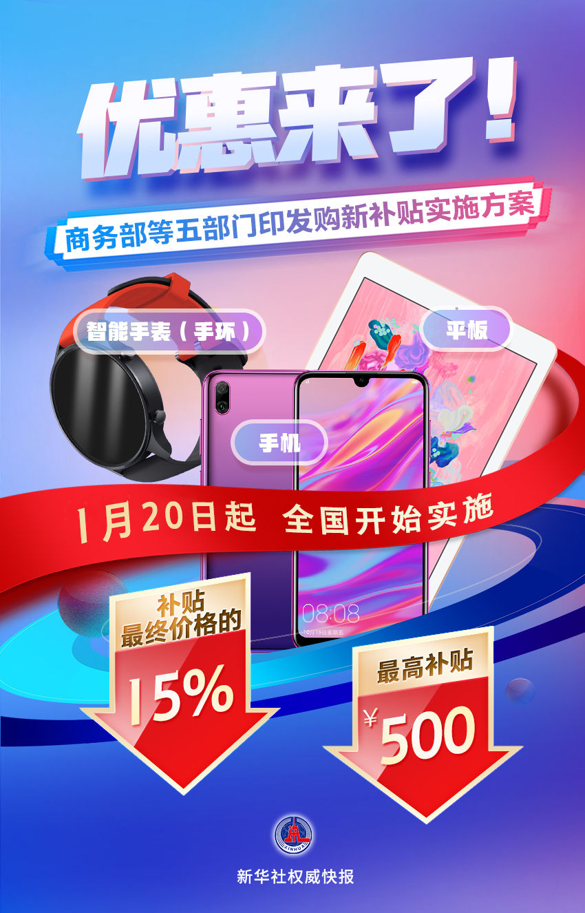 其中,手机、平板、智能手表(手环)购新补贴实施方案明确,个人消费者购买单件销售价格不超过6000元的手机、平板、智能手表(手环)3类数码产品,可享受购新补贴。每人每类可补贴1件,每件补贴比例为减去生产、流通环节及移动运营商所有优惠后最终销售价格的15%,每件最高不超过500元。各地将根据该方案细化实施细则,1月20日起全国实施。