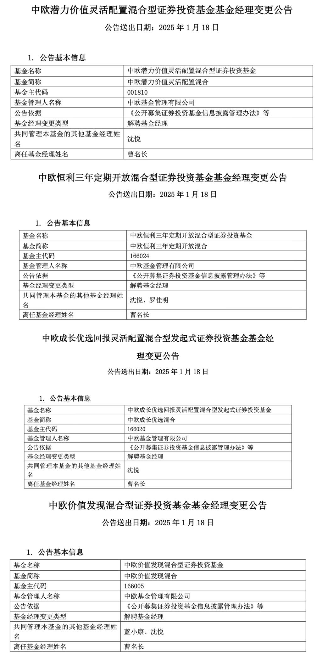 据澎湃新闻,1月17日,中欧基金管理有限公司(下称“中欧基金”)发布公告称,曹名长因“个人原因”自即日起卸任中欧价值发现、中欧潜力价值、中欧成长优选、中欧恒利四只产品的基金经理,并由同样来自价值组的蓝小康、罗佳明、沈悦等基金经理团队接任管理。