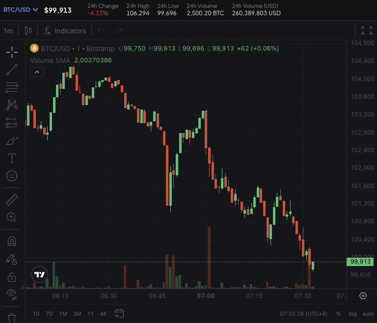 据界面新闻,1月20日,据Bitstamp报价显示,比特币跌破100000美元/枚,现报99913美元/枚,日内跌4.33%。