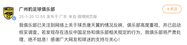 广州豹足球队回应球员唐天翼传闻:启动核查,绝不姑息。