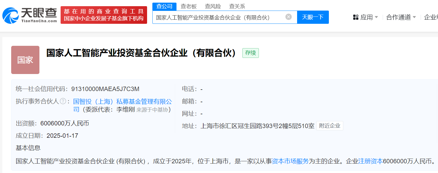 据《科创板日报》20日讯,天眼查APP显示,国家人工智能产业投资基金合伙企业(有限合伙)于1月17日成立,出资额600.6亿元。合伙人包括:国智投(上海)私募基金管理有限公司、国家集成电路产业投资基金三期股份有限公司。