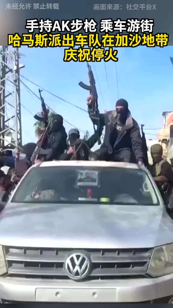 当地时间1月19日,加沙地带停火协议第阶段生效后,当地居民拍摄到大批哈马斯武装人员手持AK突击步枪,乘车在加沙城中游街,庆祝停火。(via 参考)