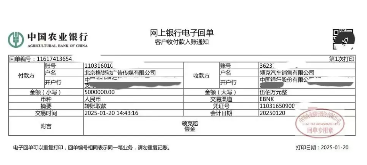 1月20日晚,汽车博主陈震在社交平台发布视频称,因其同事操作失误,在领克900发布会之前,披露了车型的信息,其向领克赔付500万元违约金,并出示了相关转账记录,并表示后续将对内部“进行流程上的优化”。