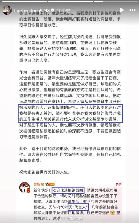 据中国新闻网,樊振东更新个人社交媒体,转发了此前自己针对饭圈的声明,再次呼吁球迷远离饭圈的戾气。他还特别圈出:“任何人的饭圈化言行对我都是有害无益的,请不要打着关心我为我好的旗号对我的工作人际关系进行代入式分析讨论甚至争吵谩骂。”