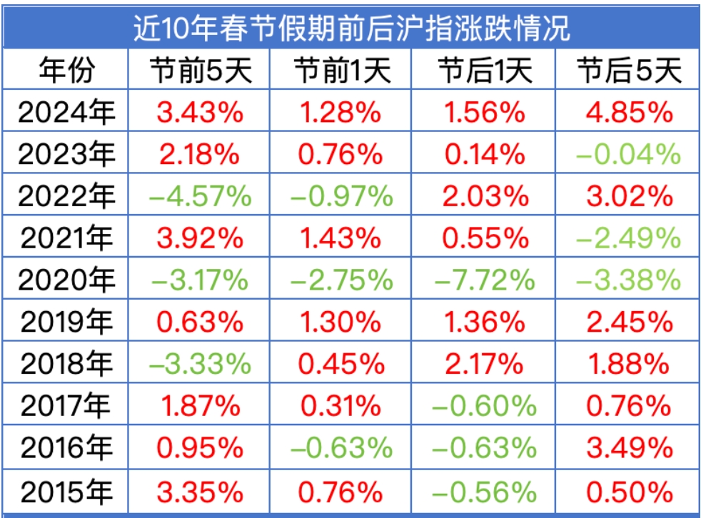 记者统计发现,历史数据显示,近10年春节假期前后5个交易日,沪指均录得7年上涨,3年下跌。春节假期前1个交易日,沪指7涨3跌;节后1个交易日,6涨4跌。整体来看,A股春节前后大概率上涨。