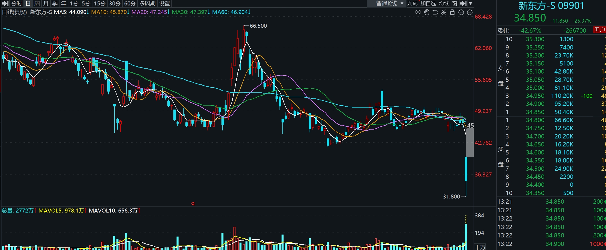 据界面,1月22日,新东方-S(9901.HK)盘初一度大跌近32%至31.8港元,股价创2023年7月以来新低。隔夜美股市场新东方(EDU.N)收跌23.22%,报46.71美元。截至中午收盘仍跌25.05%,报35港元,东方甄选盘初跌逾6%。