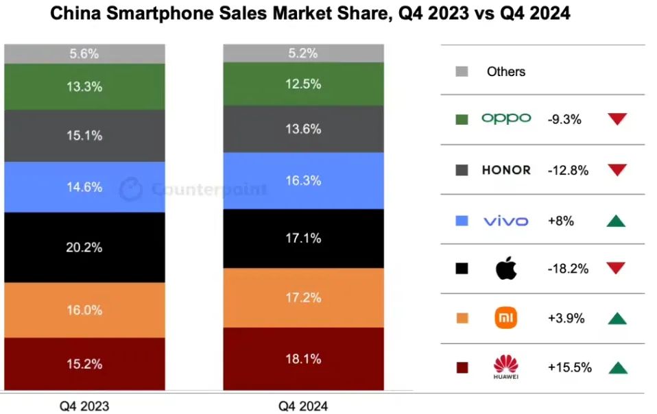 Counterpoint高级研究分析师Mengmeng Zhang表示:“2024年四季度,华为以18.1%的市场份额跃居榜首。华为销量同比增长15.5%,主要受到中端Nova 13系列和高端Mate 70系列发布的推动。”