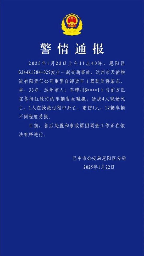 1月22日,巴中市公安局恩阳区分局发布警情通报:2025年1月22日上午11点40许,恩阳区G244K1284+029发生一起交通事故,达州市天佑物流有限责任公司重型自卸货车(驾驶员蒋某东,男,33岁,达州市人;车牌川S****1)与前方正在等待红绿灯的车辆发生碰撞,造成4人现场死亡、1人在抢救过程中死亡,重伤1人,12辆车辆不同程度受损。目前,善后处置和事故原因调查工作正在依法有序进行。